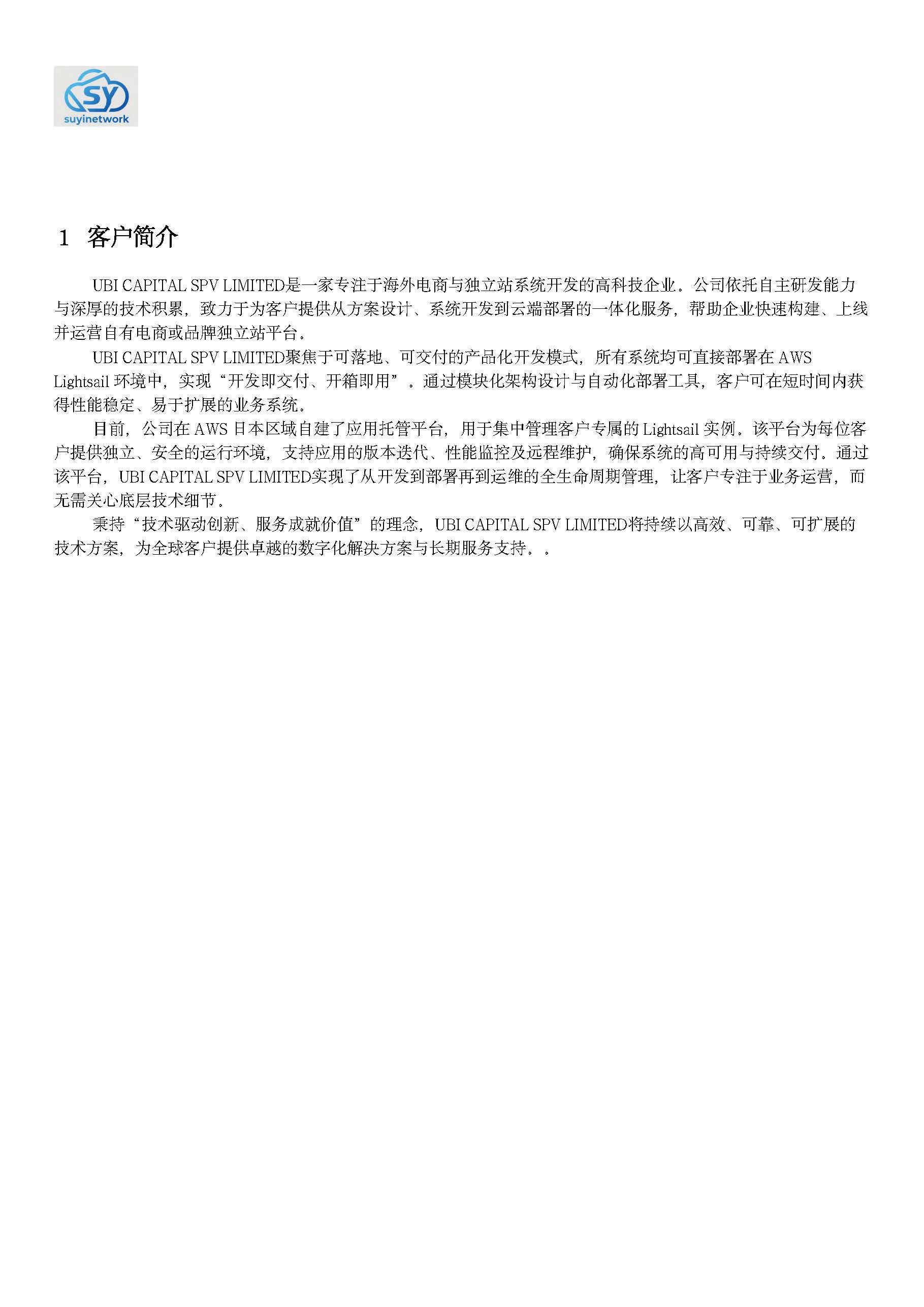 UBI CAPITAL SPV LIMITED是一家专注于海外电商与独立站系统开发的高科技企业,公司依托自主研发能力与深厚的技术积累,致力于为客户提供从方案设计、系统开发到云端部署的一体化服务。